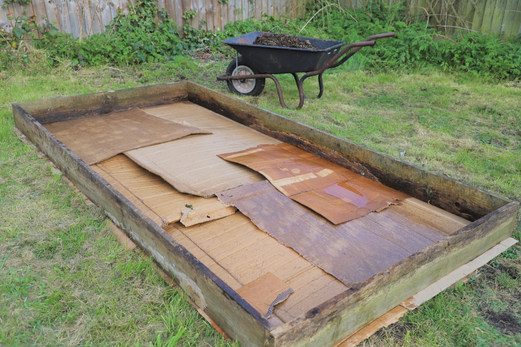 If your raised bed is being sited on top of lawn there’s no need to dig or remove turf, simply cover the ground inside the raised bed with cardboard to kill lawn or weeds by excluding light, each piece overlapping the other to prevent grass growing through gaps. Tuck it underneath the frame so that it’s just showing on the outside, this prevents lawn coming through on the inside edges of the raised bed. The cardboard will rot down naturally over time.