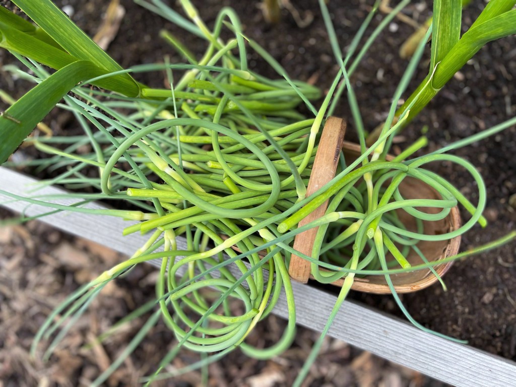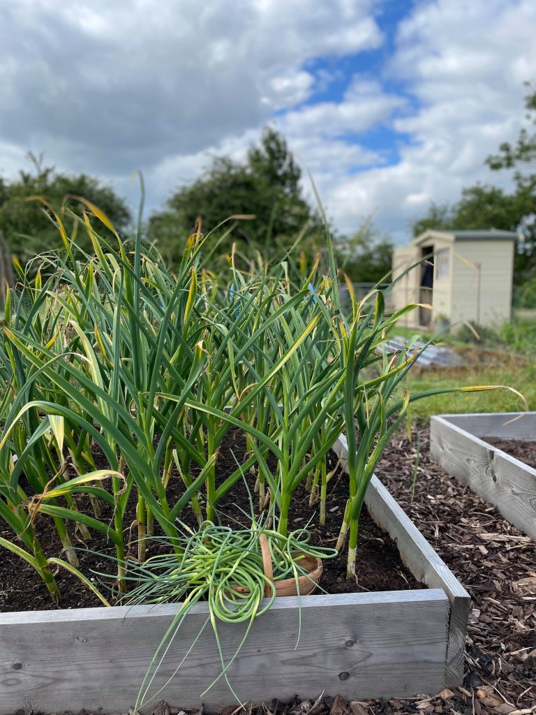 Although the plot is a bit behind this year ( the same for many other gardeners too) I have begun to harvest some things which is always exciting! Strawberries are very good this year, I suspect the wet weather of May and scorching start to June played a key role. Garlic scapes have been a real treat in stir fries, even though my sense of taste is not what it should be (thanks Covid) I could just about make out some garlicky tones. Not having my sense of smell is probably a good thing after eating this little lot, perhaps not so good for other people though……
