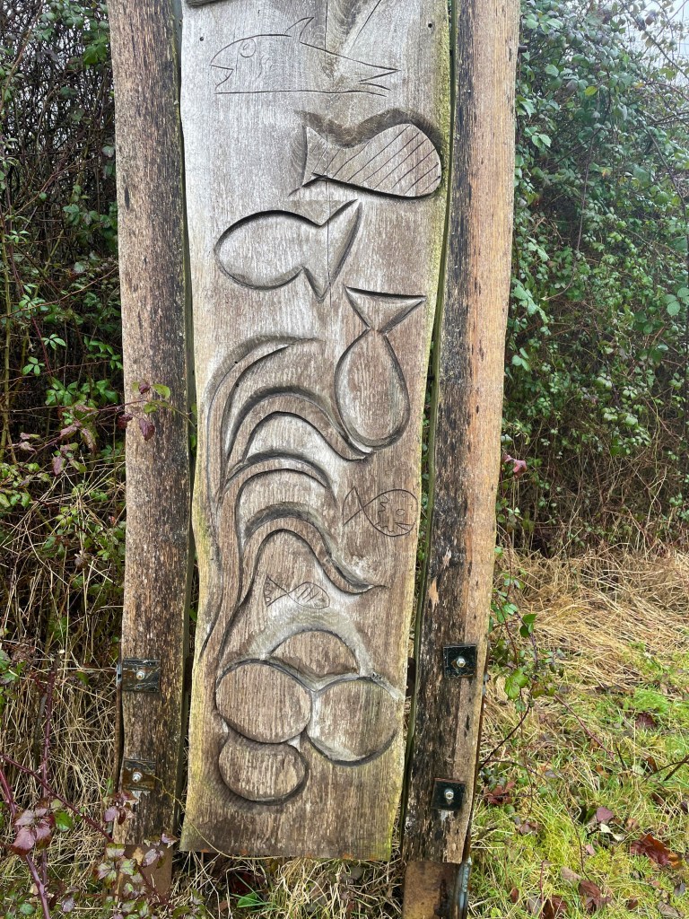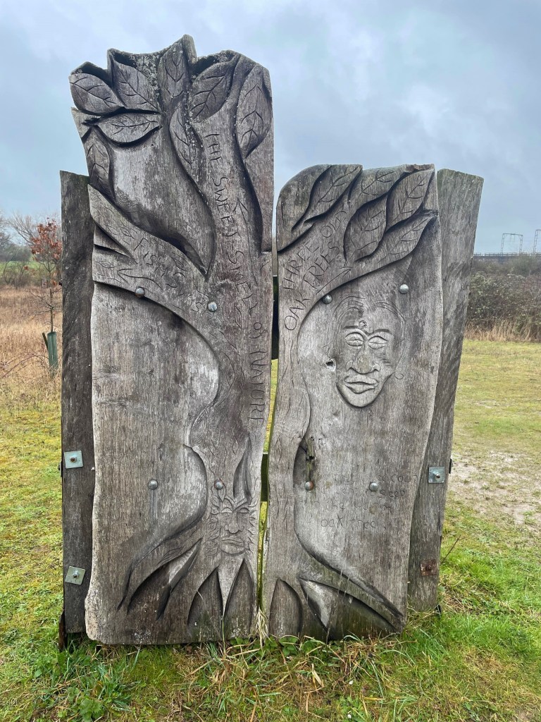 The wood sculptures in the nature reserve were designed and created in 2009 by a local chainsaw artist together with the children of the village lower school. The images, words and poetry incorporated are those of the children.