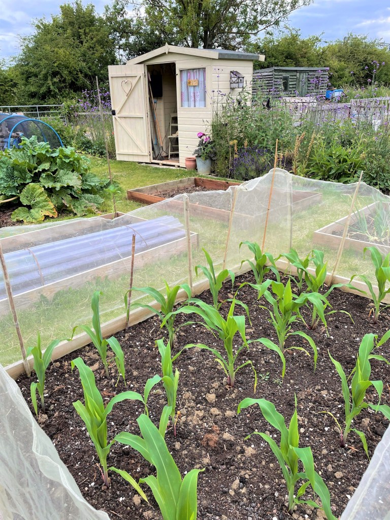 Moving on to some of the veg, sweetcorn planted out mid June is just starting to thicken up now. To prevent young plants from snapping/bending during windy weather I use mesh windbreakers until they can tough it out on their own.