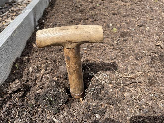 My dibber started life as garden fork, made from the broken handle fixed to a metal spike – allotment recycling at its best! I use it for various jobs such as planting spring bulbs, garlic, leeks and potatoes. It’s pretty handy actually and I use it more than I realise! There are all sorts of dibbers available but I prefer T-shaped or D-shaped handles.