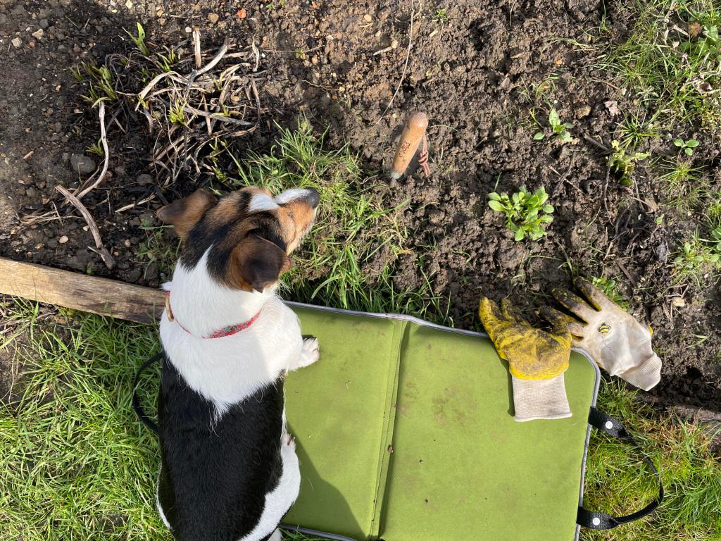 Yesterday was surprisingly warm in the sunshine and a rare break from the rain, I grabbed the opportunity to visit my allotment to plant the little daffodils. I tidied and planted up a terracotta pot that sits outside the shed and then removed stubborn grass roots from the wildlife area ready for underplanting the forsythia shrubs. Rosie pretended to supervise but all she really wanted to do was sit on my comfy kneeling pad. Smart dog.
