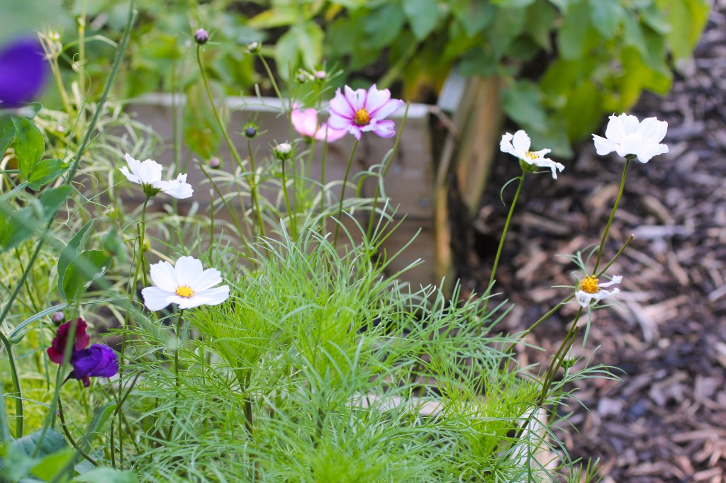 Plant shorter varieties of Cosmos amongst the veg for a pop of colour, they look great and will attract pollinators on the wing!